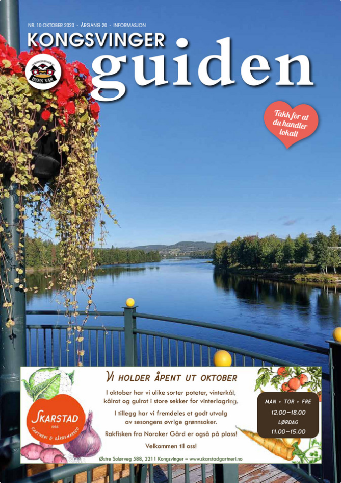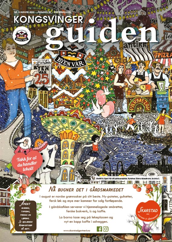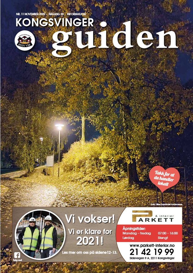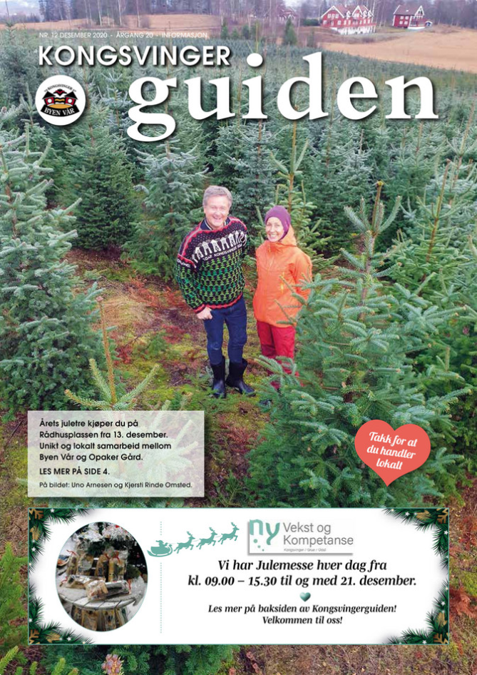 Velkommen til Desember utgaven av Kongsvinger Guiden. Nedenfor kan du lese mer om aktiviteter i Desember, og om Elvia, Caverion, Kafé Bohem, Kongsbadet, Glåmdal Sjukepleie & Bandage, Haget Rørleggerbedrift, Bilia, Bjørklund, FK Butikken, Aasum Bil, Lia Maskin & Transport, John Deere, Beitostølen og mye mer. Du finner også et intervju med Atle Pettersen på side 36!